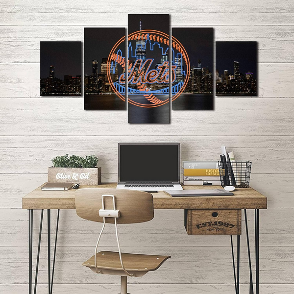New York Mets Logo MLB Baseball Team & Night City 5 Piece Canvas Wall Art Painting Wallpaper Poster Picture Print Photo Decor
